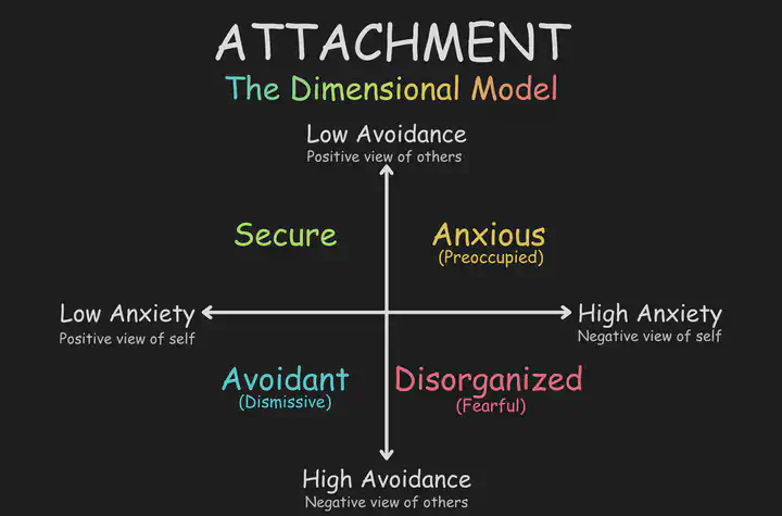Disorganized attachment style was a new addition to the classic model, as some children were just coded as “unclassifiable.” Infants did not have a coherent way of interacting with their mother during stressful times, exhibiting confusion, fear, and approach-withdrawal behaviors. Disorganized attachment in adulthood consists of both high avoidance and anxiety, resulting in a negative view of both the self and others. There can be a push-pull dynamic where there’s movement toward and away from their partner, depending on the situation. They experience conflicting desires between wanting closeness and fearing it, so their behavior becomes contradictory…hence, disorganized.